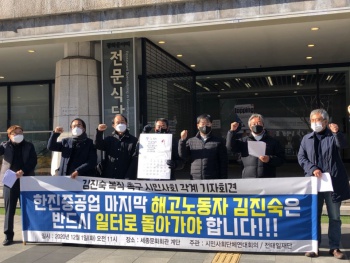 시민사회단체연대회의와 전태일재단은 1일 오전 서울 광화문 세종문화회관 계단 앞에서 ‘김진숙 복직 촉구 시민사회 각계 기자회견’을 진행했다. 89...