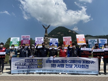 공항·항공노동자들이 한시적 해고금지 등을 내용으로 한 '고용안정 3대 요구' 1만 서명을 청와대에 전달했다.