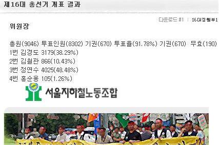 1차 투표결과 기호 1번 김경도 후보가 3179표(38.29%), 2번 김철관 후보 866표(10.43%), 3번 정연수 후보 4025표(48....