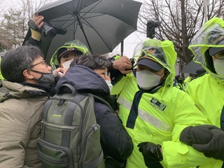 경찰이 고 문중원 기수 대책위 농성장 철거 규탄 기자회견을 하려는 참가자들을 막아 대치가 벌어졌다. 유가족을 비롯한 참가자 약 20여 명은 28...
