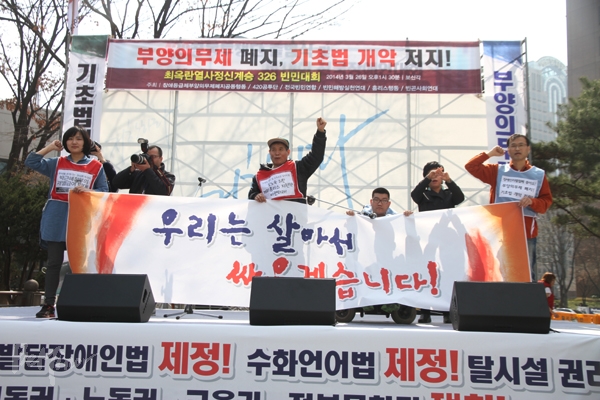 2014년 420장애인차별철폐공동투쟁단(아래 420공투단)이 26일 늦은 2시 30분 서울 보신각 앞에서 제10회 전국장애인대회를 열고 공식 출...