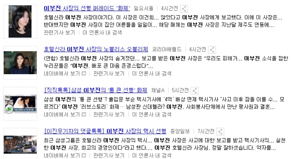 지난 19일 하루 동안 신라호텔 대표 이부진 씨의 이름이 포털 인기검색어에서 지속해서 노출됐다. ‘노블리스 오블리제’, ‘선의’, ‘통 큰 오너...