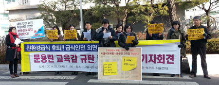 친환경무상급식과안전한먹거리서울연대는 13일 오전 서울 종로구 서울시교육청 앞에서 ‘친환경 급식 후퇴! 급식안전 외면! 문용린 교육감 규탄 학부모...