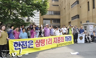 밀양 송전탑 공사가 재개된 지 이틀째인 5월 21일, 서울 삼성동 한국전력 본사 앞에서 공사 중단을 요구하는 기자회견이 열렸다.