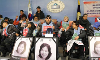 지난 2일 오후 2013년 중증장애인 24시간 활동보조 지원 예산 확보를 위해 이한구 새누리당 원내대표 면담을 요구하며 국회 기자회견장(정론관)...