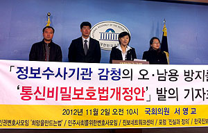 국회 법제사법위원회의 서영교 민주통합당 의원과 진보네트워크센터 등 인권시민단체들은 2일 오전 국회 정론관에서 기자회견을 열고 ‘정보수사기관 감청...