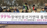 99%장애민중선거연대는 16일 이른 11시 국회 앞에서 출범 기자회견을 열고 “1% 가진 자들만을 위한 정치집단의 ‘가짜 복지’를 폭로하고, 9...