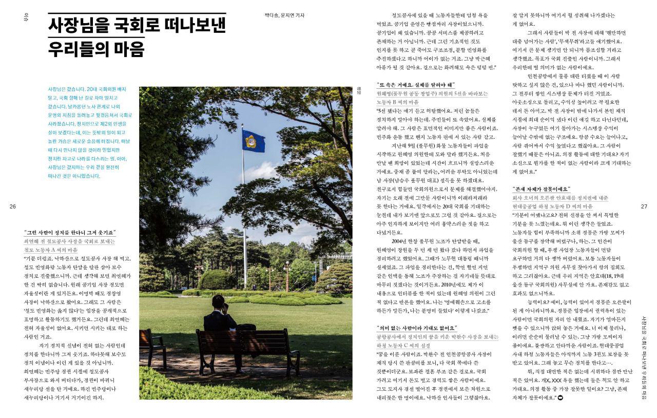 사장님은 갔습니다. 20대 국회의원 배지 달고, 국회 향해 난 길로 차마 떨치고 갔습니다. 날카롭던 노사 관계로 나의 운명의 지침을 돌려놓고 뒷...