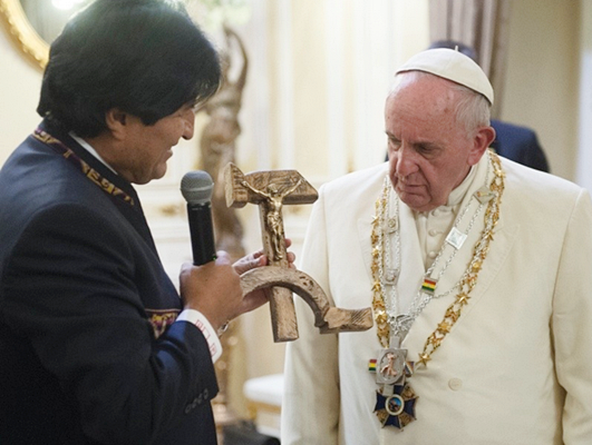 프란치스코 교황이 볼리비아 방문 중 받은 “공산주의 십자고상”에 대해 자신은 전혀 불쾌하지 않으며 그 작품을 “저항 예술”로 이해한다고 밝혔다.