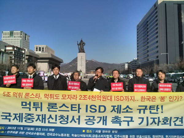 ISD(투자자 국가소송제) 중재신청서를 공개하라는 여론이 확산되고 있는 가운데 ‘론스타 공동대책위(이하 론스타 공대위)’가 신청서 공개를 촉구하...