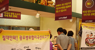 한미FTA저지대전충남운동본부(운동본부)는 13일 11시 롯데마트 서대전지점 앞에서 미국산 쇠고기 판매 중단을 요구하는 기자회견을 긴급히 가졌다.