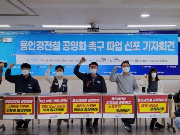 공공운수노조 용인경전철지부는 9일 오전 서울 중구 민주노총 중회의실에서 기자회견을 열고 무기한 전면 파업을 선포했다. 지부는 “누구나 자유롭고 ...