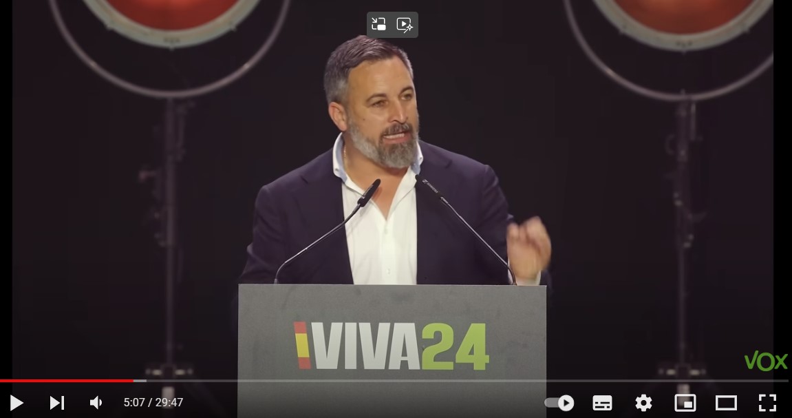 스페인 정당 복스의 지도자 산티아고 아바스칼이 2024년 5월 19일 마드리드에서 열린 전 세계 극우 정치 대회에서 연설하고 있다. 출처 : VOX 유투브 채널