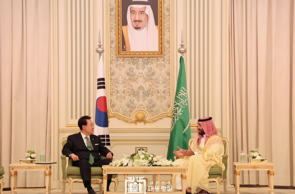 2023년 10월 사우디아라비아 리야드 야마마 궁전에서 열린 모하메드 빈 살만 사우디 왕세자와 대통령 회담. 출처 : 대한민국 외교부 홈페이지