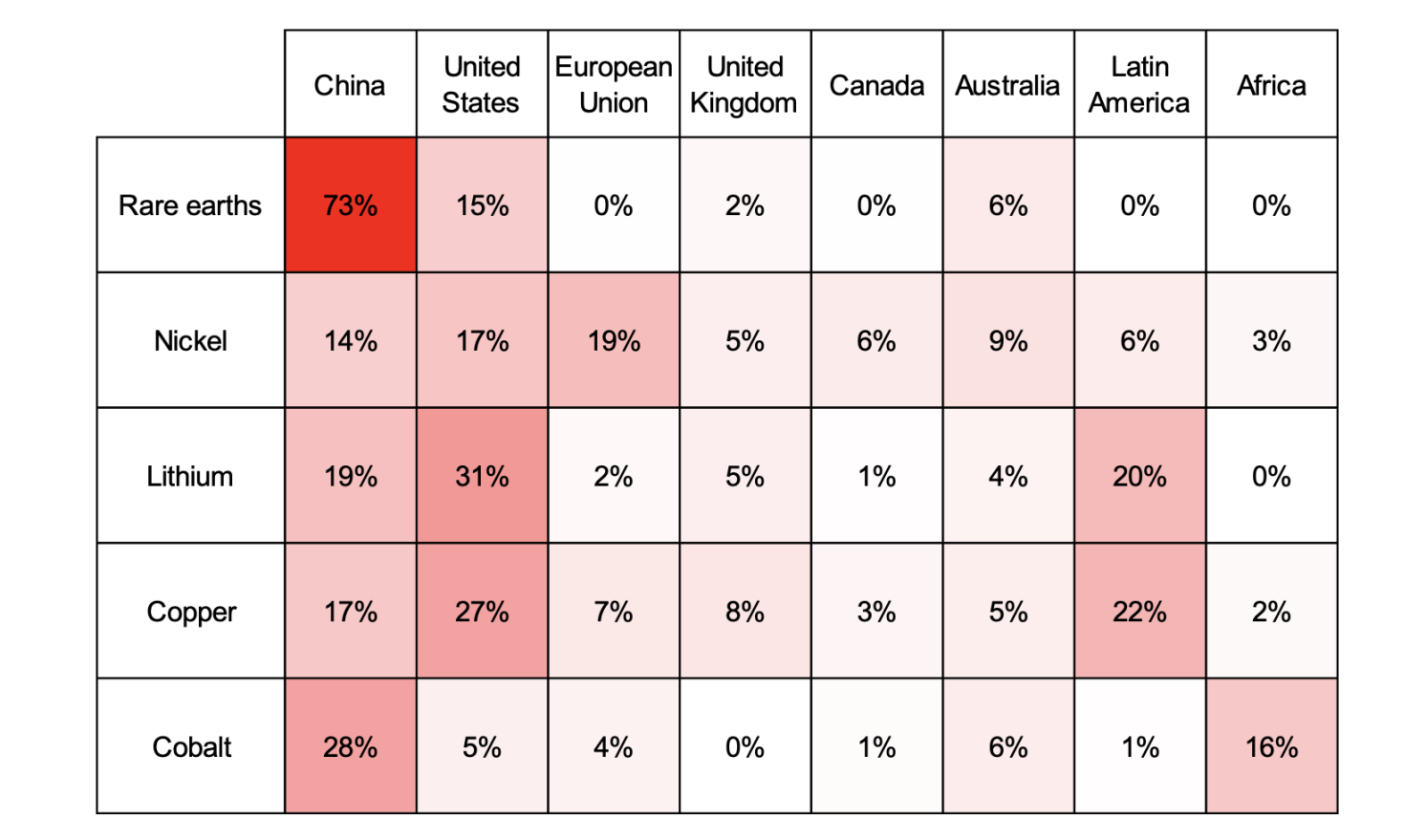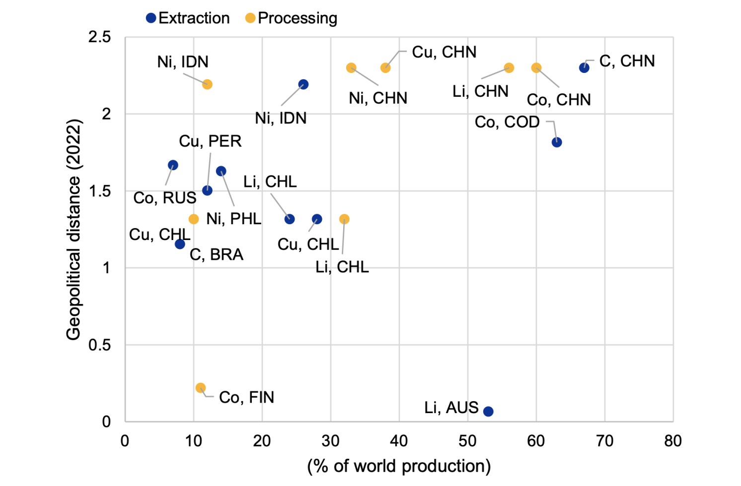 참고: 지정학적 거리는 유엔 총회에서의 투표를 바탕으로 미국이 주도하는 자유주의 질서에 대해 각 나라가 어떤 입장을 취하고 있는지를 나타낸다. 이 거리는 동적인 모델을 사용하여 계산된다. 이 지표에는 단위가 없으며 0에서 6까지의 범위가 있다. 각 광물 및 생산 단계별로 주요 생산국 두 곳만 표시된다. C는 천연 흑연, Co는 코발트, Cu는 구리, Li는 리튬, Ni는 니켈을 나타낸다. AUS는 호주, BRA는 브라질, CHL은 칠레, CHN은 중국, COD는 콩고민주공화국(DRC), FIN은 핀란드, IDN은 인도네시아, PER은 페루, PHL은 필리핀, RUS는 러시아를 나타낸다.