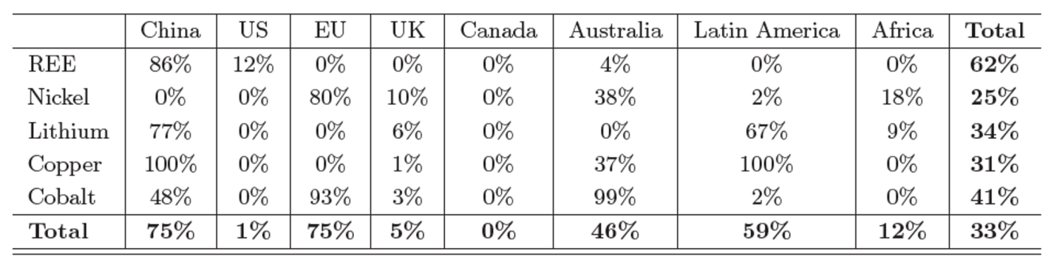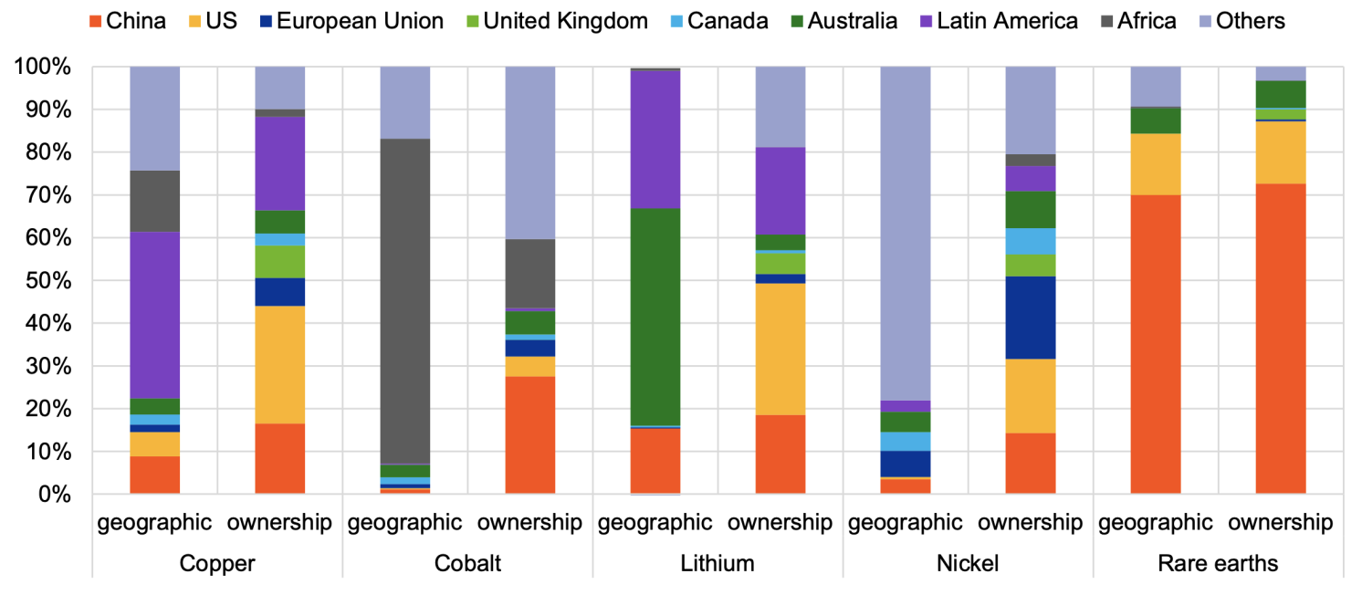 자원의 지리적 집중에 대해서는 잘 알려져 있지만(IRENA 2023, Javorcik 외 2023), 채굴 회사의 소유권에 대해서는 그렇지 않다. 그러나 채굴 회사의 지배 구조를 문서화하는 것은 전략적 의존성을 평가하는 데 필수적이다. Leruth 외(2022)를 기반으로, 우리는 코발트, 구리, 리튬, 니켈, 희토류 채굴에 관여하는 글로벌 상장 기업의 주주 출신을 문서화하는 포괄적인 데이터베이스를 설계했다(Faubert 외 2024).