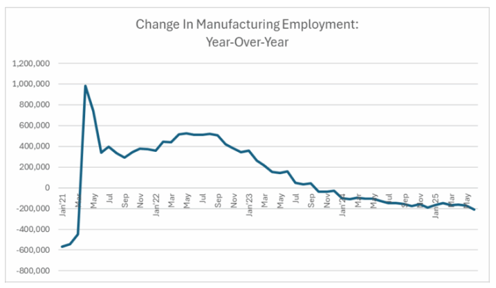최종 QCEW 데이터는 아직 나오지 않았지만, BLS는 더욱 최근의 예비 데이터를 공개하고 있다. 지난주에는 2025년 2분기까지의 자료를 발표했는데, 이는 CES보다 훨씬 큰 폭의 제조업 고용 감소를 보여주었다.