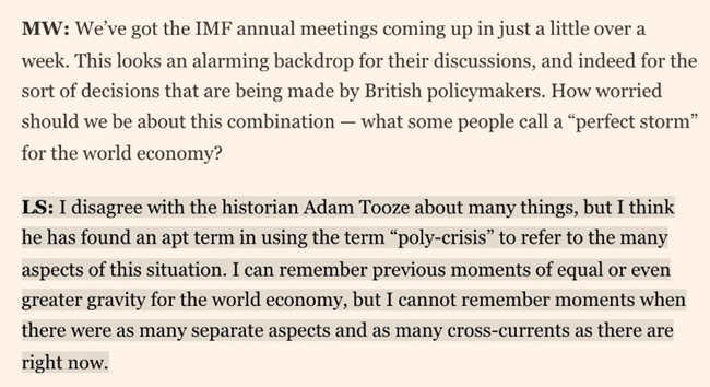 LS: 나는 역사학자 애덤 투즈와 여러 사안에서 의견이 다르다그러나 그는 현재의 상황이 지닌 다양한 측면을 가리키는 데 다중위기(poly-crisis)’라는 표현을 적절하게 찾아냈다고 생각한다나는 세계 경제에 있어 이와 같거나 혹은 더 심각했던 순간들을 기억한다그러나 지금처럼 서로 다른 요인들이 이렇게 많고상호 충돌하는 흐름이 이렇게 많이 동시에 작동했던 때는 기억나지 않는다.